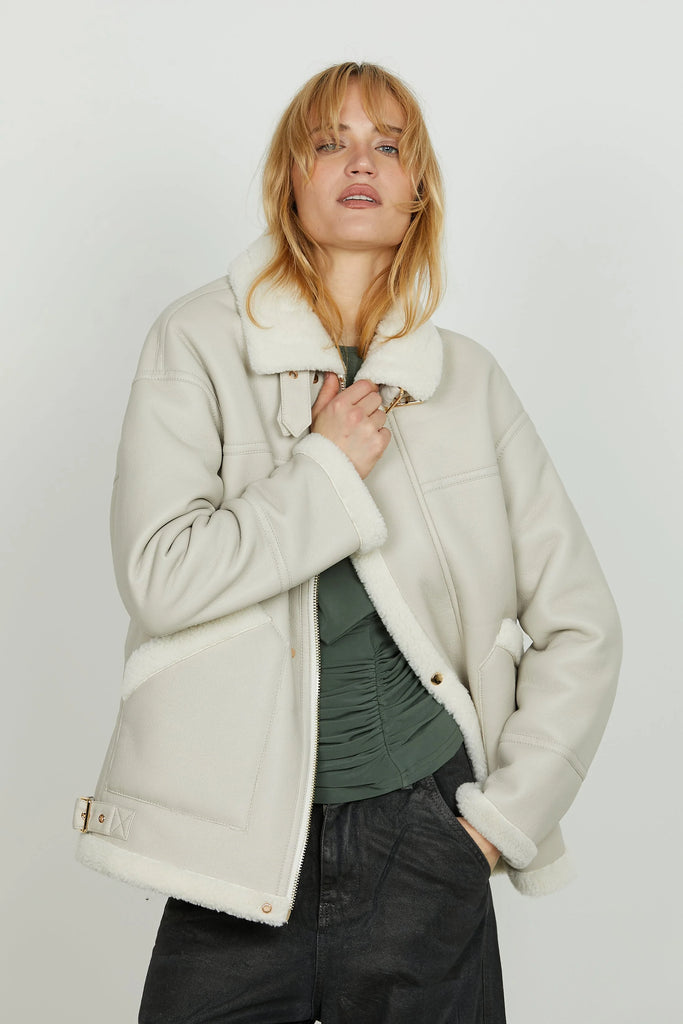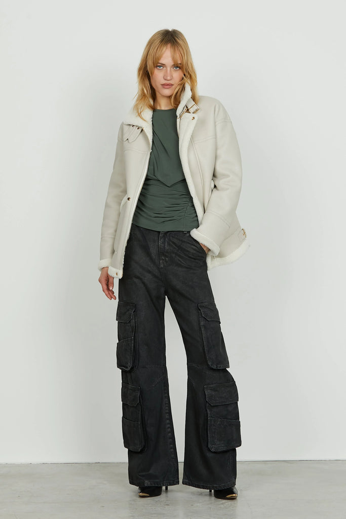 Μπουφάν από οικολογικό δέρμα με μουτόν επένδυση και λεπτομέρειες, με διακοσμητικές ζώνες.