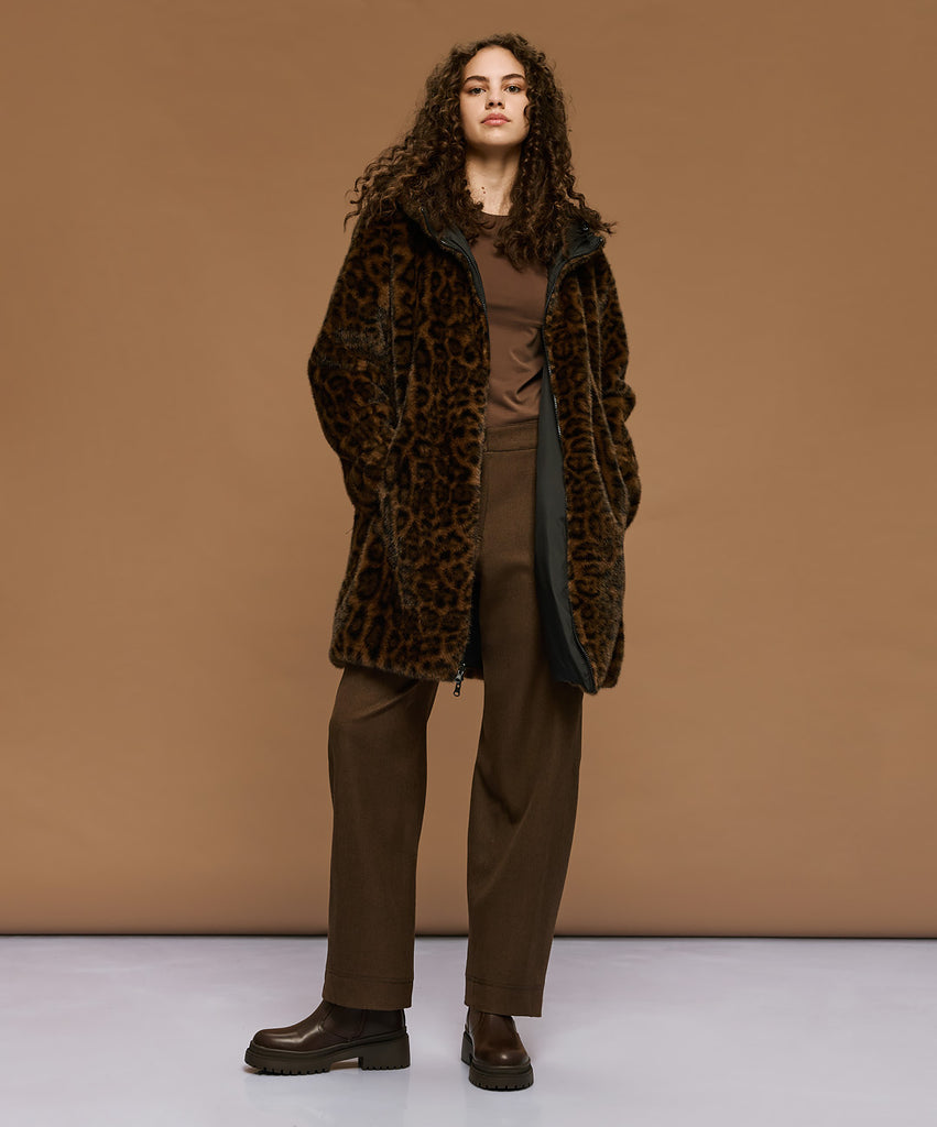 Τζάκετ από συνθετική γούνα, διπλής όψης. Διαθέτει κουκούλα, τσέπες και στις δύο όψεις και κλείνει με φερμουάρ. Διαθέσιμο σε λεοπάρ/μαύρο και μαύρο/μαύρο χρώμα.