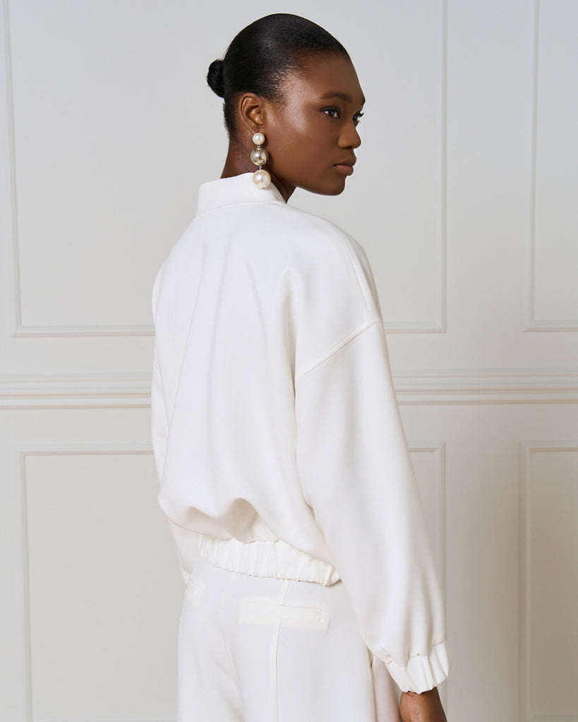 Bomber τζάκετ με εντυπωσιακά κεντήματα από στρας. Διαθέτει ελαστικές μανσέτες, λάστιχο στο τελείωμα και κλείσιμο με φερμουάρ στο μπροστινό μέρος. Διαθέεσιμο σε άσπρο και μαύρο χρώμα.