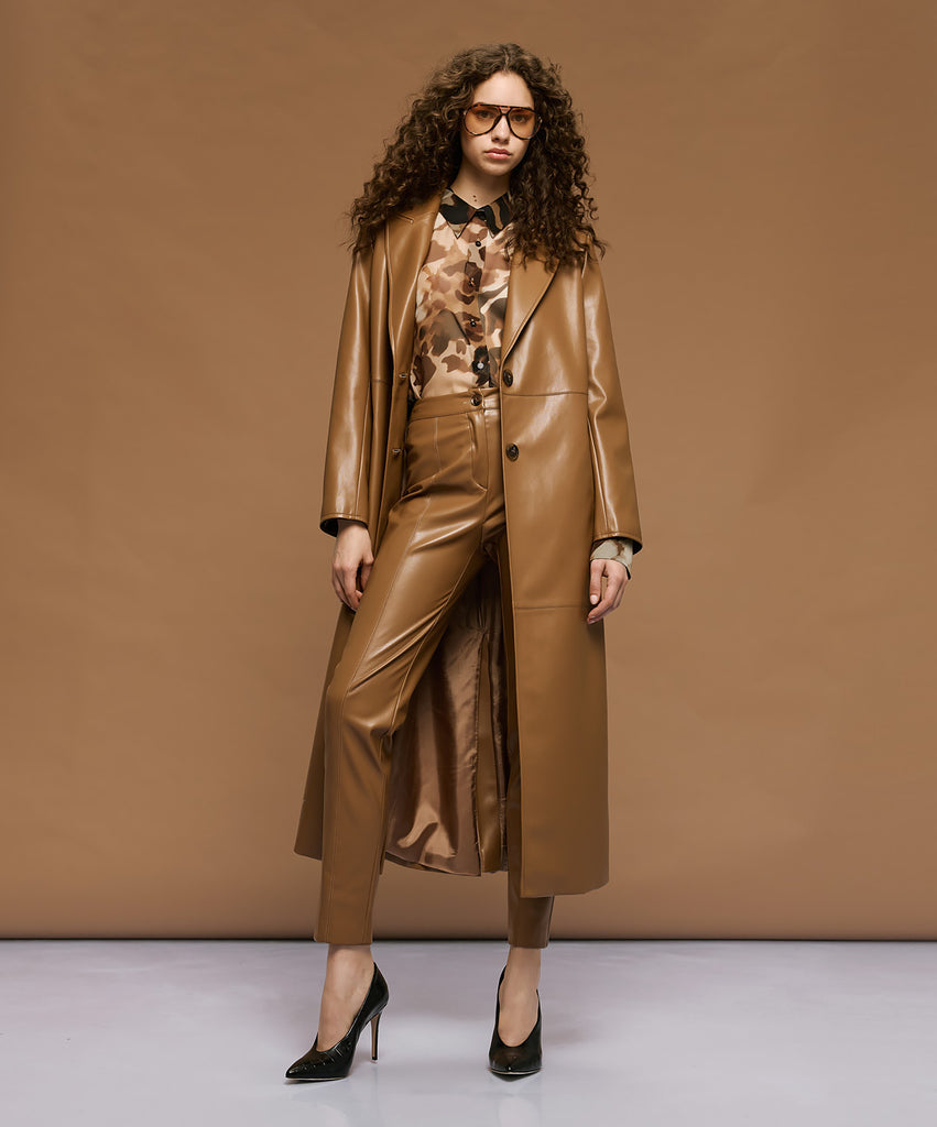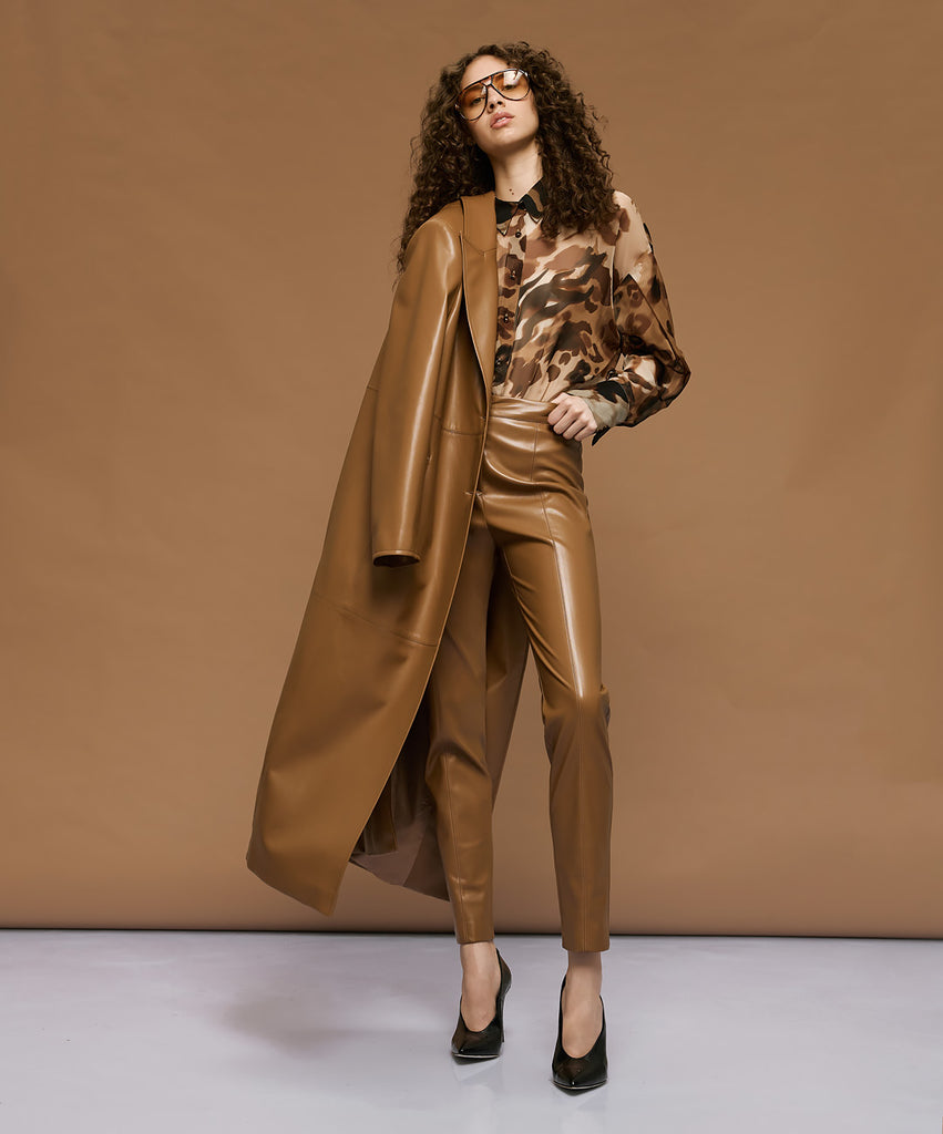 Ψηλόμεσο παντελόνι όψης δέρματος με ραφή μπροστά. Διαθέσιμο σε κάμελ και μαύρο χρώμα.
